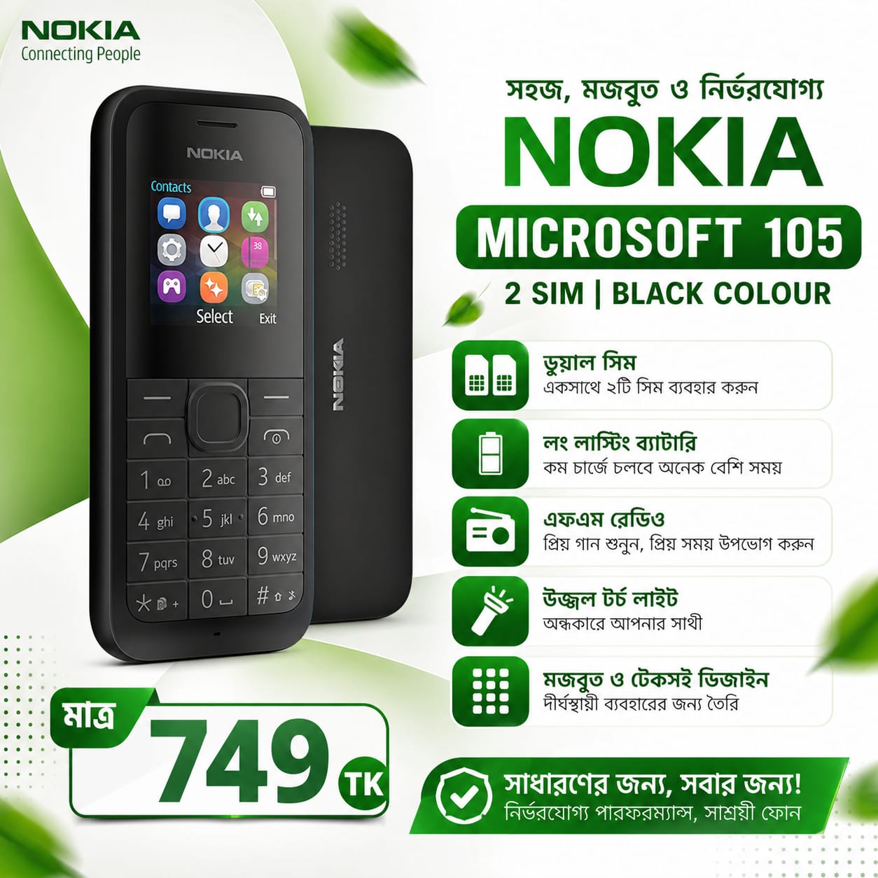 - Nokia 105 ২টি সিম কার্ড সাপোর্টেড।